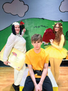 Snoopy, played by Dorothy Clark, and Woodstock, played by Sophie Yoke, receive more valentines than Charlie Brown, played by Zach Gaston, in a scene from “You’re a Good Man, Charlie Brown” opening at 7:30 p.m. March 19 at Parkersburg High School. (Photo Provided)
