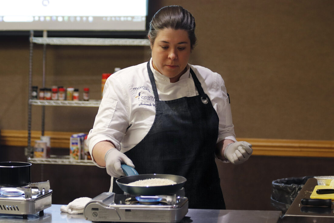 - Hannah Wolfe sautés rice in a pan at the GoPacks Top Chef Challenge Friday evening. (Photo by Gwen Sour)