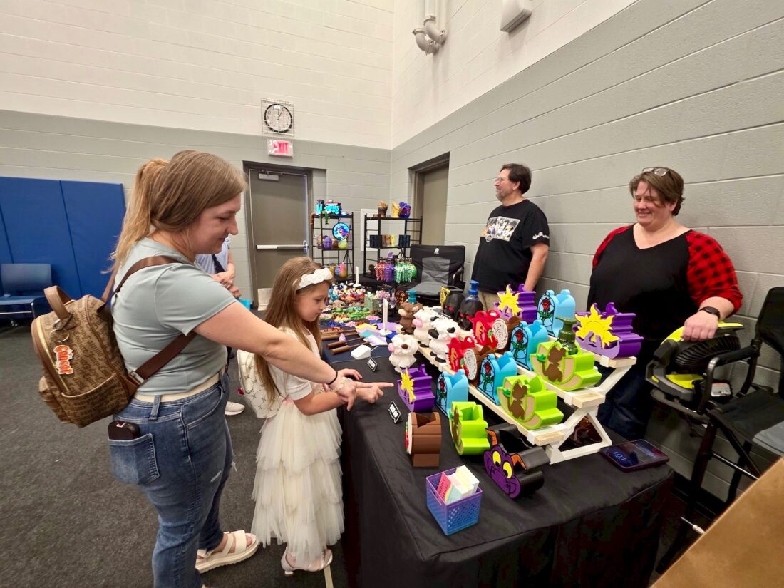 From left, Zoe and Lilia Funk check out the 3-D-printed goods offered by Chris and Meryl Walker during a craft show Saturday at Warren High School. (Photo by Gwen Sour)