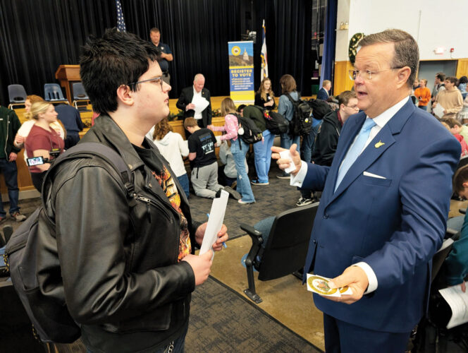 West Virginia Secretary of State Kris Warner points to Parkersburg South High School seniors and juniors during a voter education and registration assembly Tuesday at the school. A representative of Warner’s office said 120 students filled out registration forms.