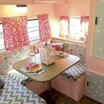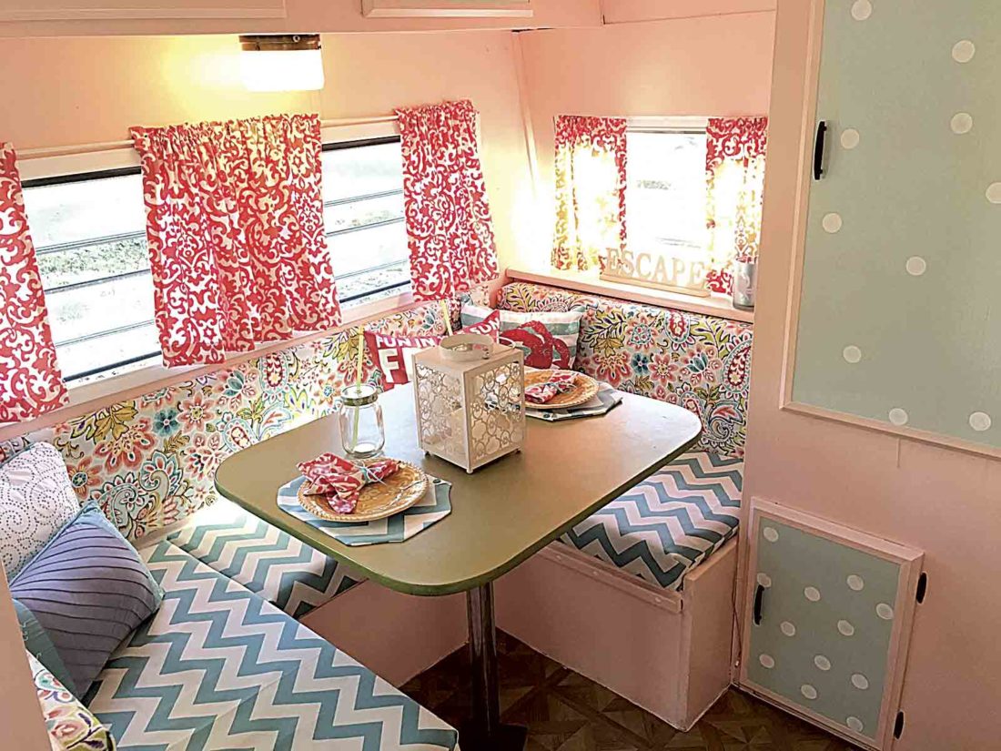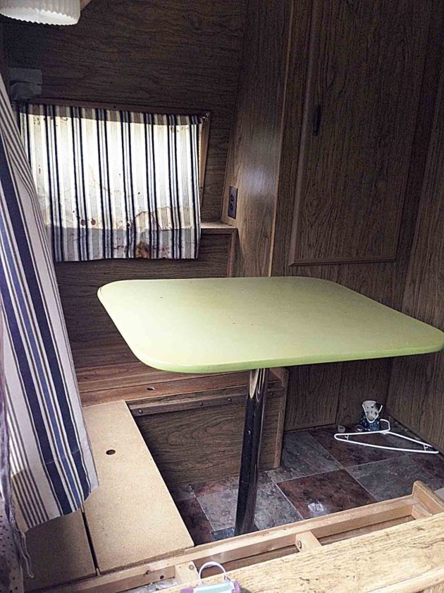 Ellie’s grandma Mary and mother re-covered the upholstery for the seat cushions and made curtains while Ellie installed new floor tiles.
