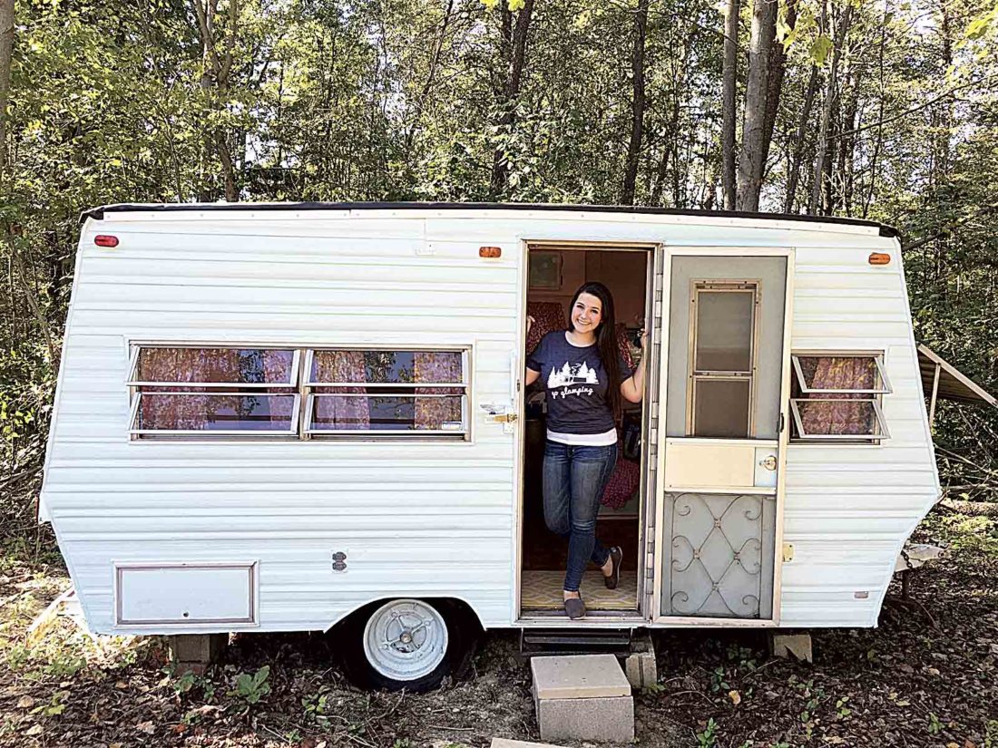 Photo Provided Ellie Yeater at the door of her remodeled “glamper,” with its new Mystic Sea exterior.