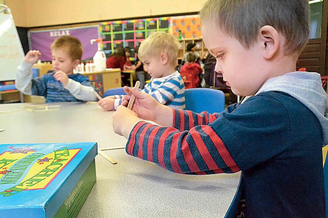 Photo by Peyton Neely Roman Hardie, 4, makes letters out of Popsicle sticks with classmates Tucker Frick, 4, and Dylan Coombs, 5, during class on Monday at the Jane Edwards Head Start Center in Marietta.