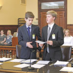 Photo by Janelle Patterson Warren High School students Joe Allen, 16, left, of Coolville, and William Christian, 18, right, of Vincent, represent the mock plaintiff at the Washington County Courthouse on Friday.