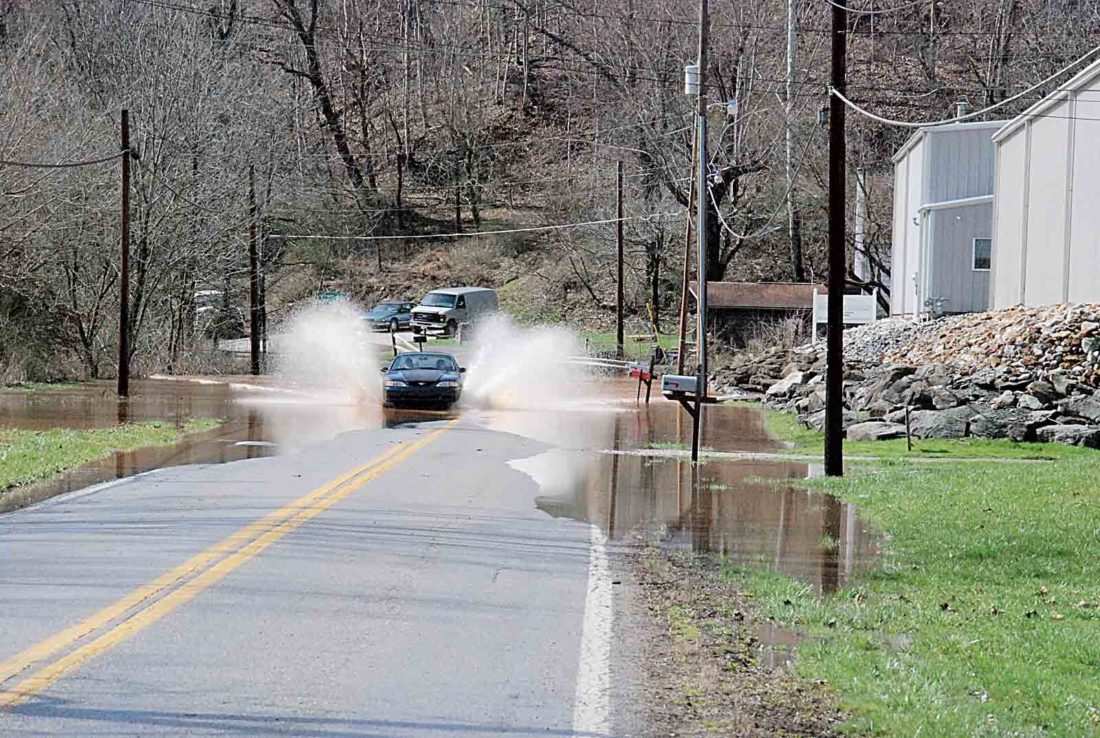 - Photo by Evan Bevins A car drives through water across Old St. Marys Pike near Newbanks Road just outside Parkersburg Wednesday afternoon.