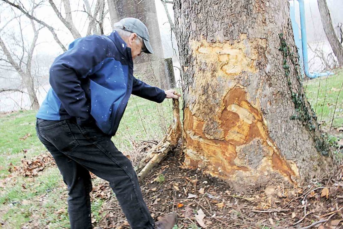 Photo by Janelle Patterson On Thursday, Tree Commission member Rhea Bockhorst reviews damage to a sycamore tree sustained over the weekend in an alleged drunken driving incident on the River Trail.