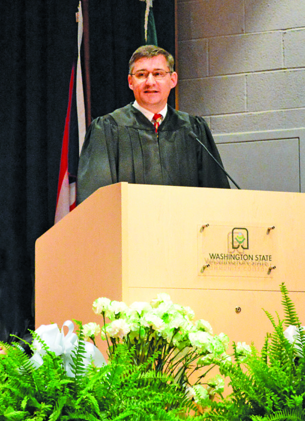 Photo by Doug Loyer Commencement speaker Washington County Common Pleas Court Judge Mark Kerenyi addresses the audience.