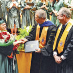 Photo by Doug Loyer Washington State Community College’s 10,000th graduate turned out to be Suzanne Paugh shown being congratulated by President Bradley Ebersole and Mark Nutter, Vice President for Academic Affairs at WSCC.