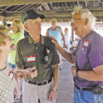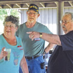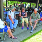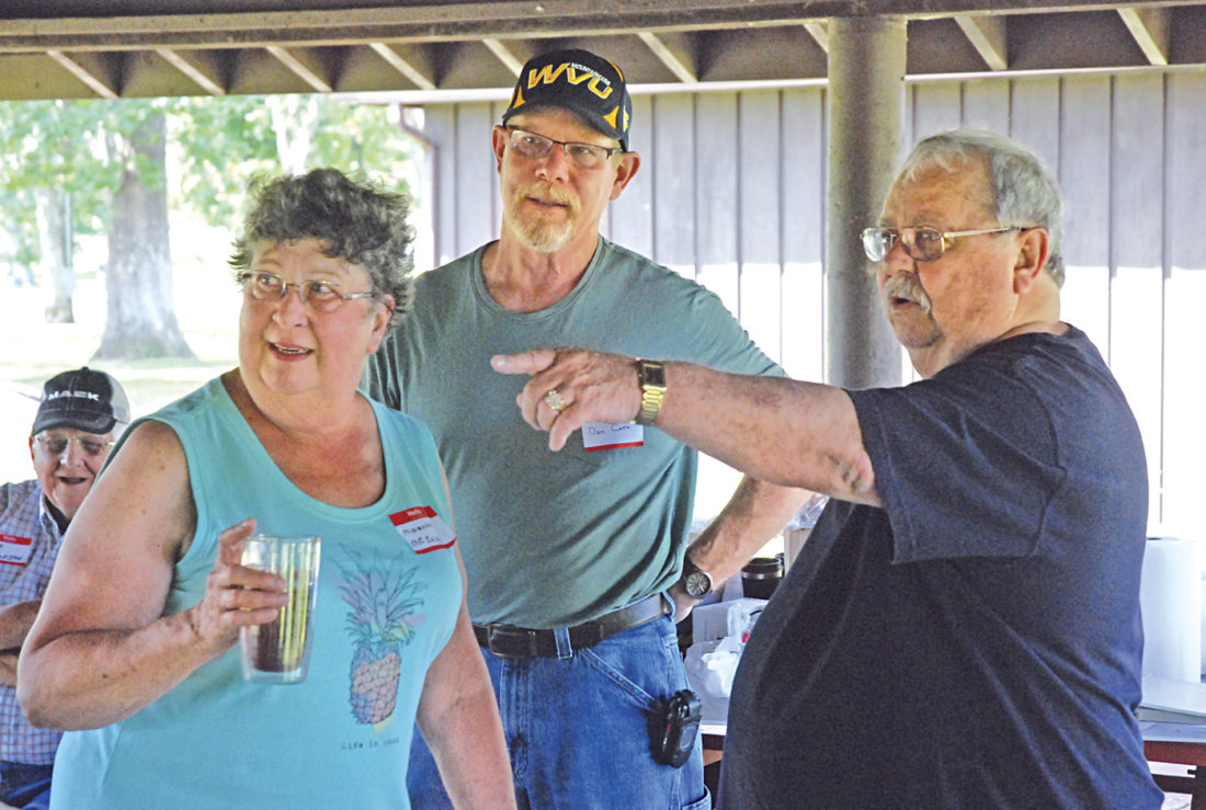 Photo by Evan Bevins From left, Williamstown resident Martha McCale, Belpre resident Dan Carr and Parkersburg resident Carland Barker scope out which former co-workers from the Woodmar Plant in Washington Bottom came to Saturday’s picnic at City Park.