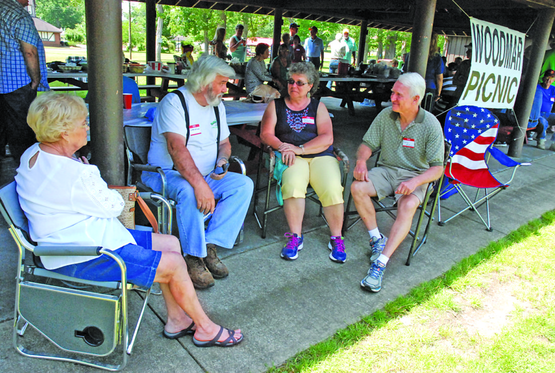 Photo by Evan Bevins From left, Parkersburg residents Nancy and Gary Williams and Washington Bottom residents Marcie and Gary McMahan visit Saturday during the 14th annual Woodmar Plant friends and family picnic. Gary Williams and Gary McMahan said the plant provided each of them with a good wage and lifestyle over more than 30 years.