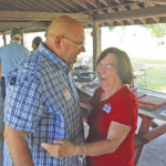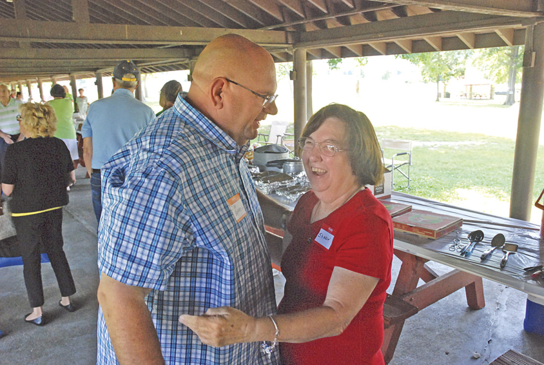 Photo by Evan Bevins Jim Gorrell, left, a 20-year employee of GE and SABIC, shares a hug with Sharon Lowe, who worked in the cafeteria of the plant for 34 years at the 14th annual Woodmar Plant friends and family picnic Saturday.