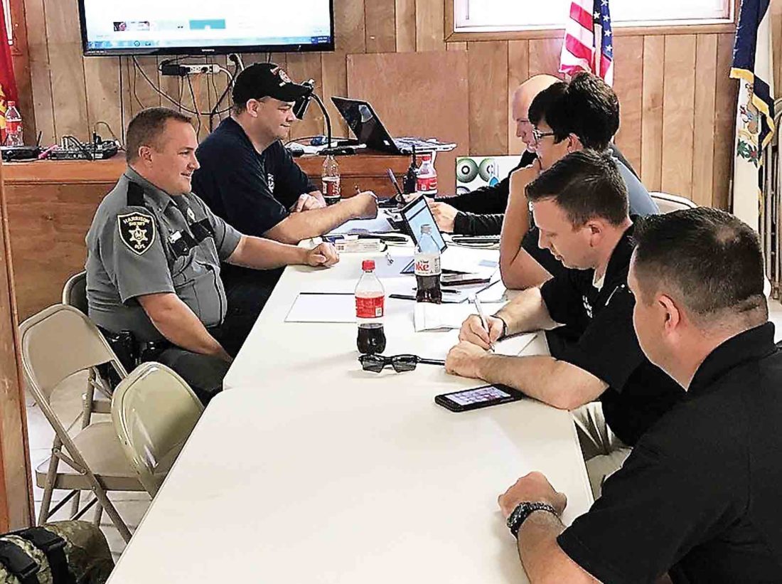 Photo provided by Harrison County Sheriff’s Office Authorities gather at a command post set up in Wallace to discuss the search for an aircraft that was last detected near the Wetzel/Harrison County line.