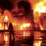 - Photo by Jeff Baughan A firefighter carries a hose past a burning section of the Ames Plant fire Saturday morning.