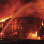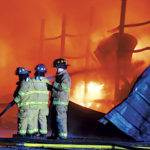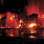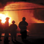 East Wood Volunteer Fire Department crews battle part of Saturday morning’s Ames Plant fire at the rear of the plant.