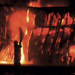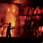 - Photo by Jeff Baughan A Blennerhassett Volunteer Fire Department firefighter battles a section of the Ames Plant fire Saturday morning.
