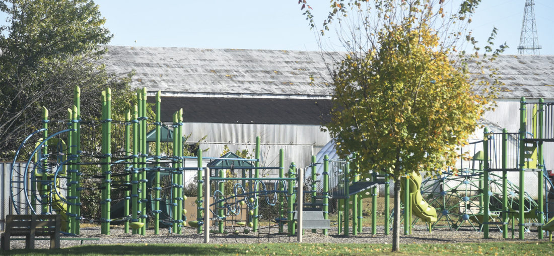 - The playground at Greenmont School sits a short distance from the giant metal warehouse buildings.