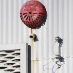 - A fire alarm mounted on an exterior wall above a window covered with expanded metal once produced at the location.