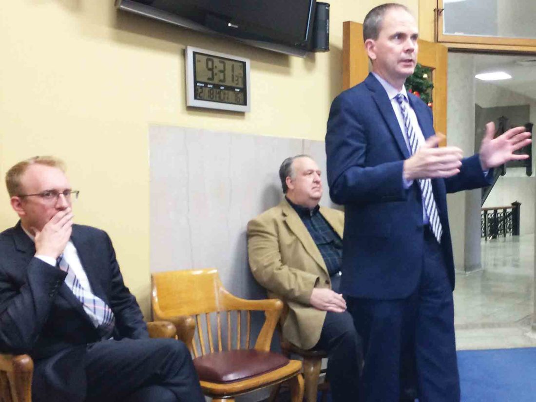 OVU Executive Vice President Jeff Dimick gives a presentation to the Wood County Commission Monday about the OVU-ACE Project as attorney Paul Wisor and OVU Business Department Chairman Daniel Blair look on. (Photo by Brett Dunlap)