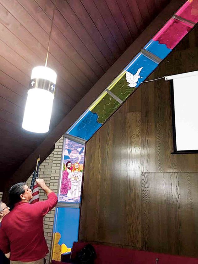 Photo Provided Tom Pralley, left, oversees the installation of stained glass at Cedar Grove United Methodist Church.