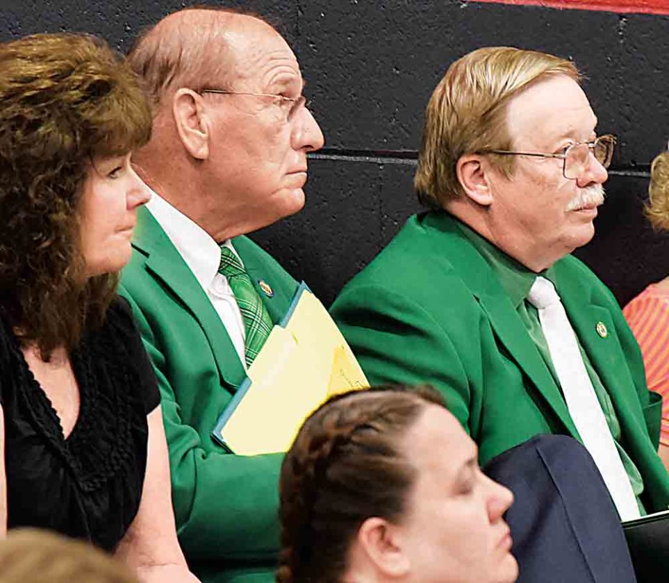 Photo by Jeff Baughan Former Marshall University football coach Bob Pruett, left, and John Sines, representing the Marshall University Mid-Ohio Valley Alumni Club, await their turn to present scholarships to Marshall University Thursday at the Parkersburg South High School Senior Awards assembly. Sines and Pruett presented 19 students with scholarships through the local alumni chapter and the Marshall Foundation. Ian McKnight was presented the Yeager Scholarship, the highest bestowed by Marshall.