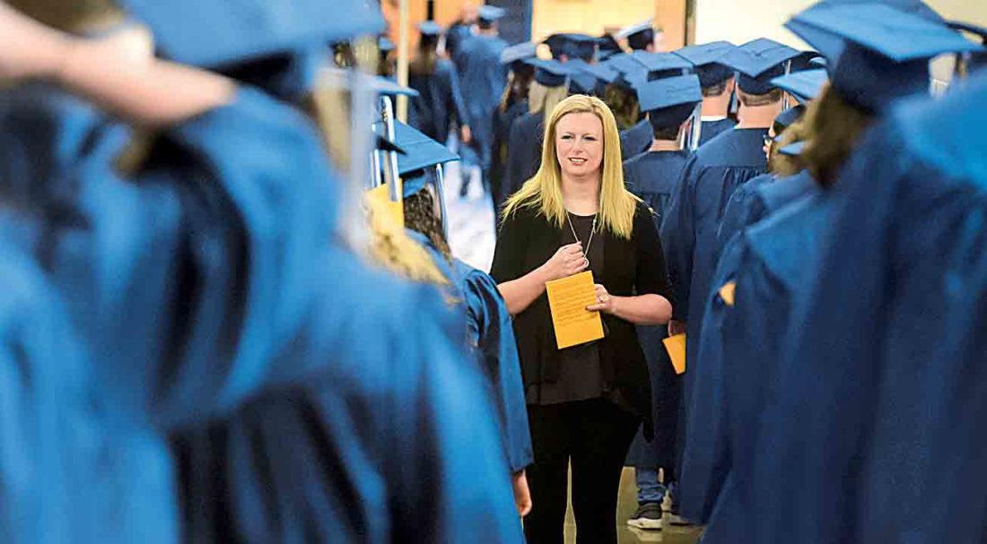Photo by Jeff Baughan Parkersburg South High School Assistant Principal Maria Miller greets the two rows of graduating seniors as they enter the Roy McCase Gymnasium at South Thursday for the South Senior Awards assembly.