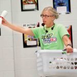 Photo by Michael Erb Gihon Elementary School physical education teacher Mischa Johnson distributes bowling pins Wednesday to be set up in the school gymnasium for an activity. Officials are using a grant from Fuel Up to Play 60 to give students additional opportunities for physical activity and to encourage healthy eating habits.