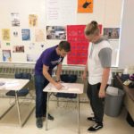 They’re not registering the whole senior class just yet — only the students who will turn 18 before Nov. 6. They’ll hold another drive later in the school year to get the rest of the seniors. The volunteers go over a list and bring in fellow classmates to register.