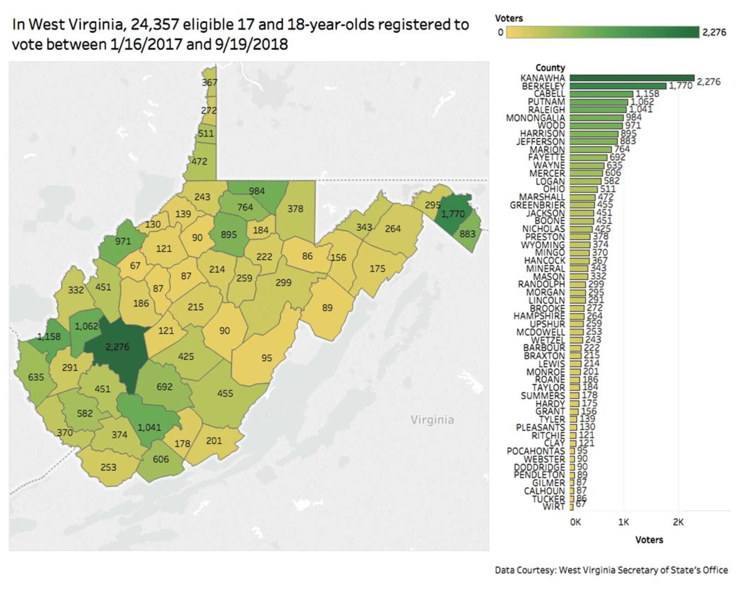There are 1.2 million West Virginians registered to vote, and of that number, more than 78,000 registered since Warner took office. As of Wednesday, 24,357 18-year-olds have registered to vote in all 55 counties.