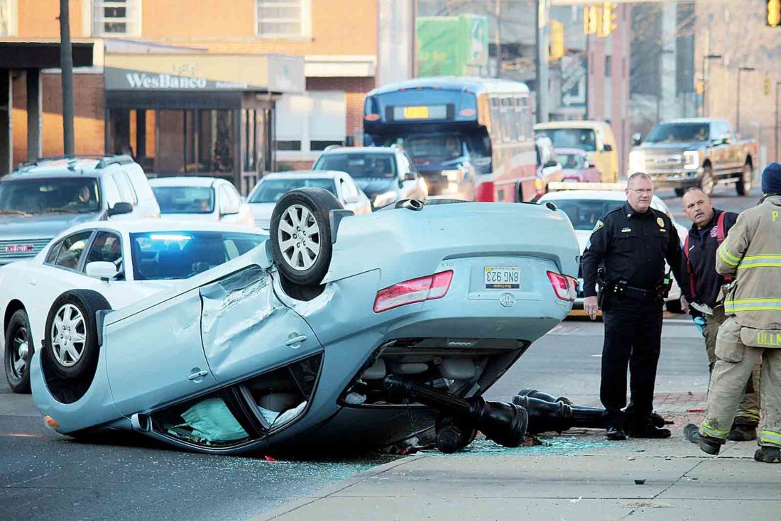 Photo by Michael Erb A two-vehicle crash Wednesday morning put a car on its top at the intersection of Fifth and Juliana streets in Parkersburg. No one was injured, but Juliana was reduced to one lane of traffic as crews cleaned up the scene. This was the second crash this week at that intersection.