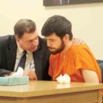 Attorney George Cosenza, left, speaks with Trent Stanley at the conclusion of a hearing Monday in which Wood County Circuit Court Judge Jason Wharton sentenced Stanley to three to 15 years in prison on four charges of third-degree sexual assault related to Stanley’s relationship with a juvenile female he coached in soccer. (Photo by Evan Bevins)