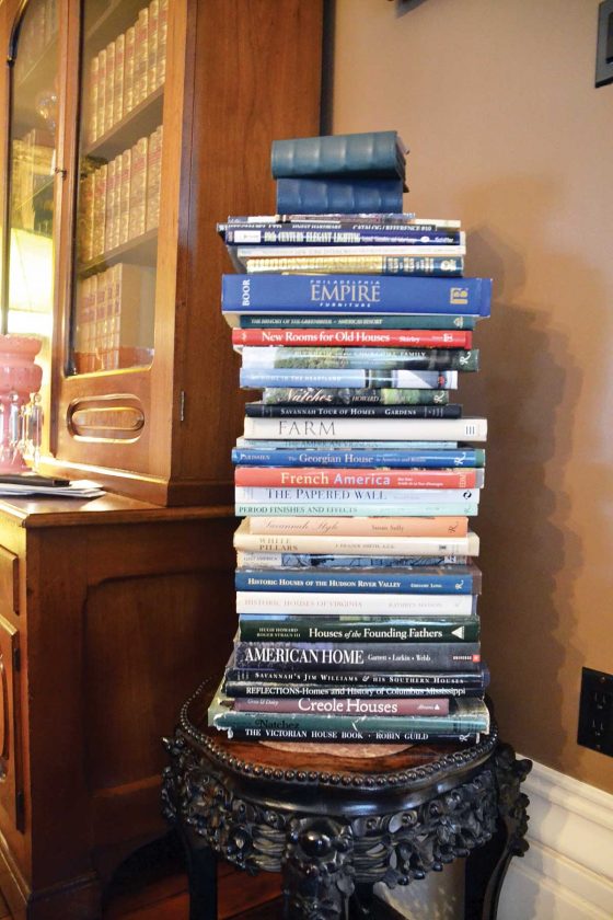 Photo by Michael Kelly Books stacked in the living area of Larchmont House were used as references by David Dernberger and Geoffrey Coward during the long restoration and repair efforts they put into the house.