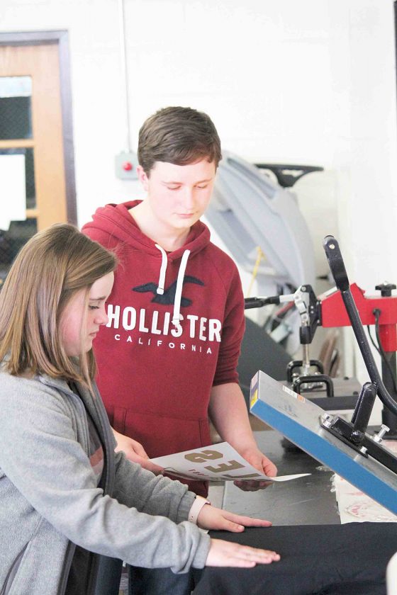 Photo by Michael Erb Edison Middle School eighth-graders Alexis McMillion, left, and Kaleb Tanner, right, demonstrate how logos are applied to the blank shirts as part of their Empowerment Class. The clothing is pre-made, but all of the design and production is performed by students at the school.