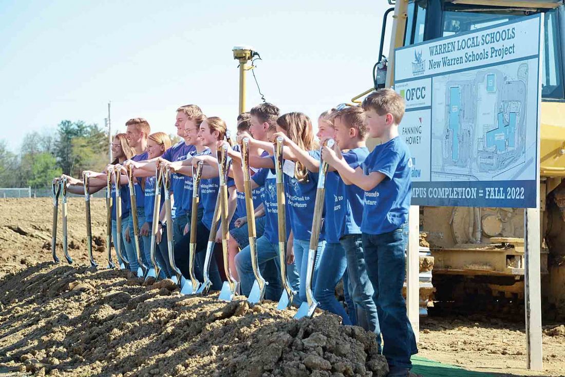 - A line of 14 students stands by shovels to initiate the groundbreaking for the Warren Local Schools building project Monday afternoon at the site for the district’s new elementary school, which will go up next to the middle school building on Warrior Drive in Vincent. (Photo by Michael Kelly)