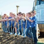 A line of 14 students stands by shovels to initiate the groundbreaking for the Warren Local Schools building project Monday afternoon at the site for the district’s new elementary school, which will go up next to the middle school building on Warrior Drive in Vincent. (Photo by Michael Kelly)