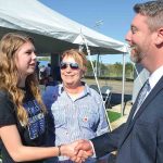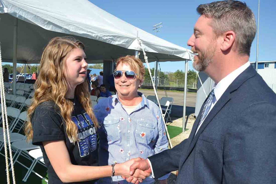 Warren Local Schools Superintendent Kyle Newton talks to Joyce Crum, a fifth-grade teacher at Warren Middle School, and her granddaughter Melanie Rhodes, a sophomore at Warren High School, after the groundbreaking for the district’s new elementary school Monday afternoon. (Photo by Michael Kelly)