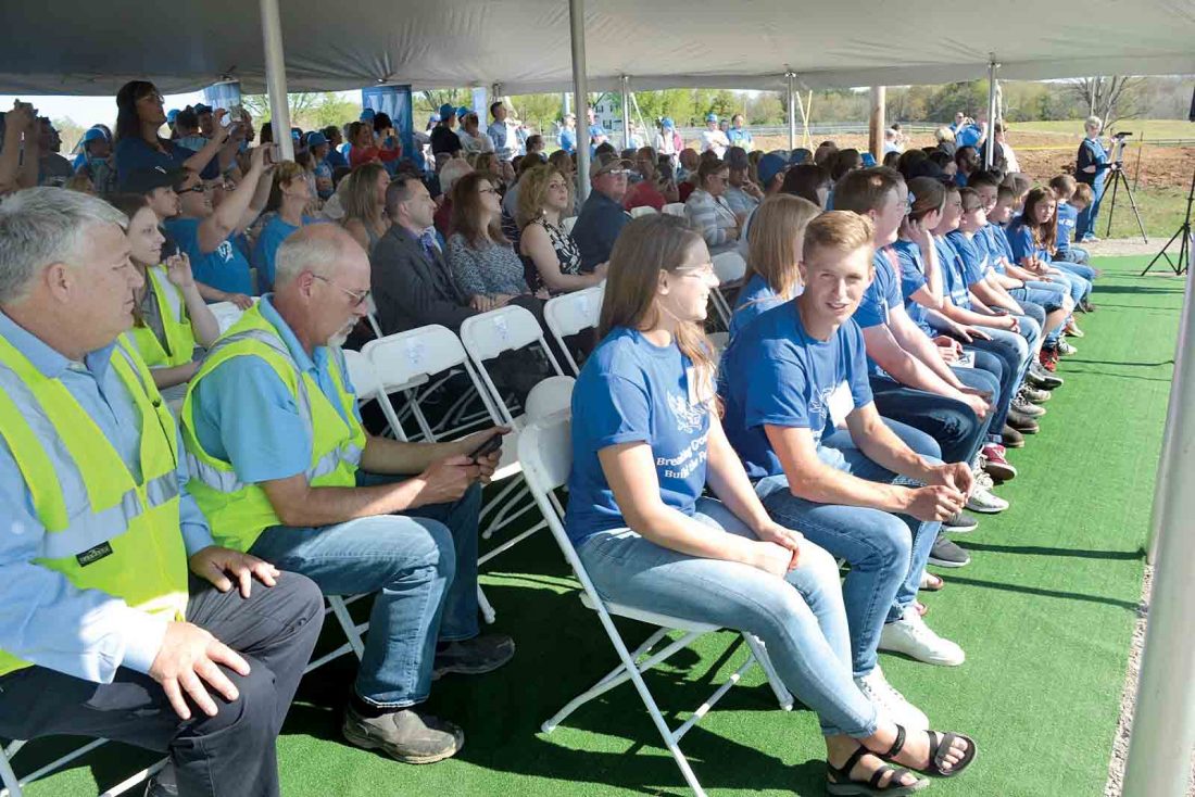 Students dressed in Warrior blue wait to be called forward to hold shovels at the groundbreaking for the new Warren Elementary School on Monday afternoon. The students were chosen by the principals at each of the district’s schools. (Photo by Michael Kelly)
