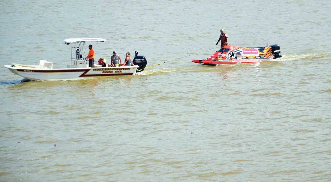 - Although he led for the majority of the final powerboat race at the 19th annual Riverfront Roar in Marietta, Jeff Reno’s boat had a breakdown in the 27th lap of the 30-lap race on Sunday. He had to be towed to shore. (Photo by Brett Dunlap)