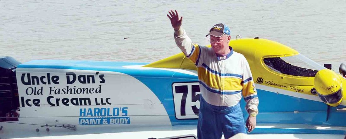 After winning the final powerboat race Sunday at the 19th annual Riverfront Roar in Marietta, Michael “Hurricane” Floyd of Rincon, Ga., greeted the crowd as his boat was towed up the boat ramp from the river. Floyd ran out of gas as he was taking his victory lap and had to be towed to shore. (Photo by Brett Dunlap)