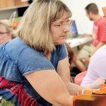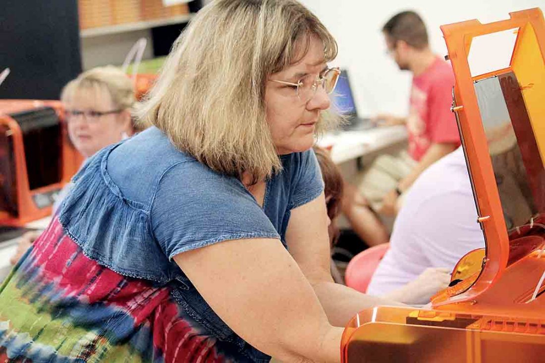 - Sherry Morris, a second-grade teacher at Martin Elementary School, installs a spool of filament in a 3D printer Wednesday during Wood County Schools Tech Week teacher training at Parkersburg High School. (Photo by Michael Erb)
