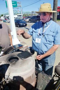 - Bo Kirkpatrick of Cincinnati, owner of a 1909 Stanley E-2, talks about how the boiler in his steam-powered car works during a car tour stop Wednesday outside the Oil and Gas Museum in Parkersburg. (Photo by Brett Dunlap)