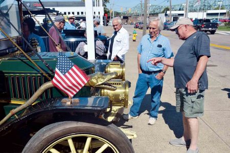 Mark Turner of Detroit, the owner of a 10hp 1923 Stanley Model 63, talks to local residents about his steam-powered car during a stop that included 17 cars, known as Stanley Steamers, Wednesday at the Oil and Gas Museum in Parkersburg. (Photo by Brett Dunlap)