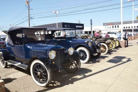 Around 17 Stanley Steamers came to the Oil and Gas Museum at 119 Third St. in Parkersburg for a few hours on Wednesday as residents looked at the cars and asked the owners questions about them while they were parked in the Matheny Motors lot. (Photo by Brett Dunlap)
