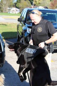 Wood County Sheriff’s Department Deputy Taylor Phillips hoists police dog Drago by its vest during a demonstration Thursday at Lubeck Elementary School during Heroes Day. Phillips said the vest both protects Drago and allows it to be lifted or carried into areas if needed. (Photo by Michael Erb)