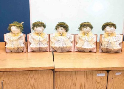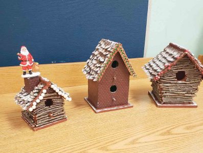 The students’ two wreaths, choir of angels, three birdhouses and Christmas tree made of corks will be up for bids at the silent auction on Dec. 4.