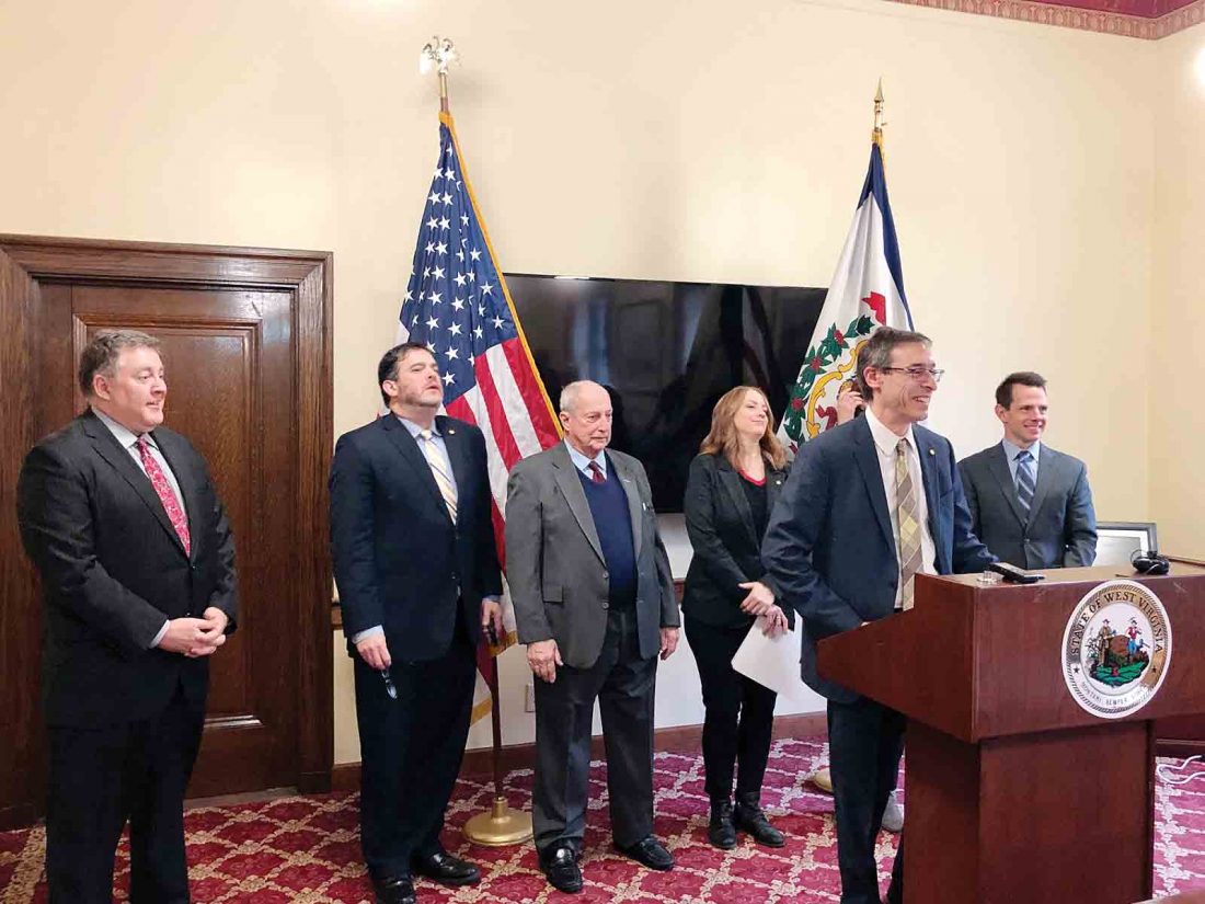 Delegate Evan Hansen, D-Monongalia, speaks as he is joined by members of the Democratic House minority to roll out the West Virginia Clean Drinking Water Act. (Photo by Steven Allen Adams)