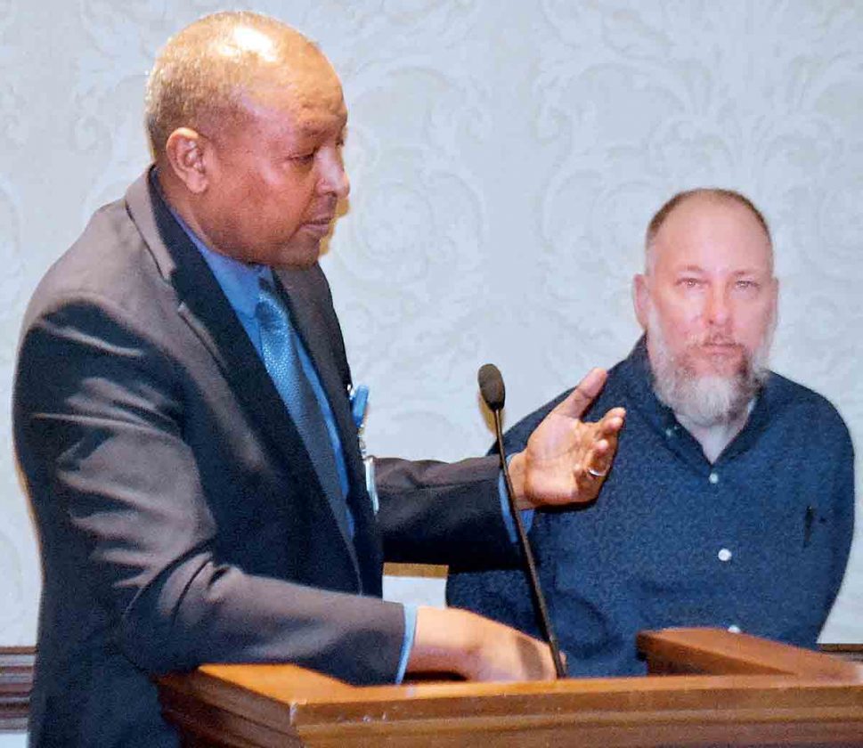 - Memorial Health System interventional cardiologist Dr. Solomon Bagae and nurse practitioner John Arnold talk about treating heart failure during a Provider Series Dinner at the Blennerhassett Hotel Tuesday evening. (Photo by Brett Dunlap)