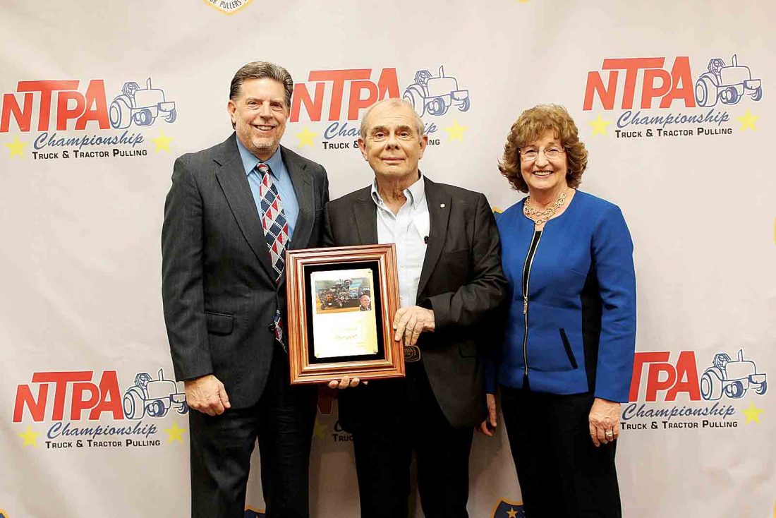 From left, Jim Sube of the National Tractor Pullers Association presents the induction certificate to Dave Archer upon his induction into the National Tractor Pullers Hall of Fame. Archer, who has been involved in the sport for more than 40 years, underwent a double-lung transplant, but plans to return to the competition. At far right is his wife, Arlene. (Photo Provided)