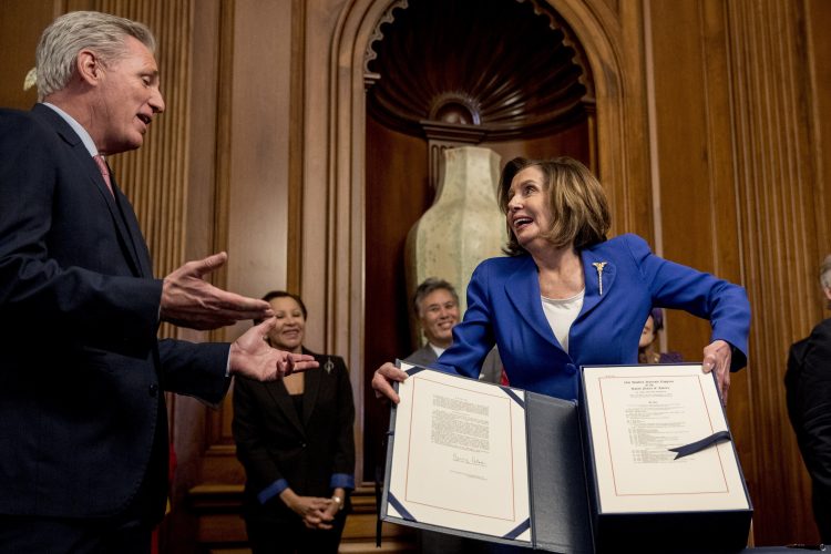 House Speaker Nancy Pelosi of Calif., right, speaks with House Minority Leader Kevin McCarthy of Calif., left, as she holds up the Coronavirus Aid, Relief, and Economic Security (CARES) Act after signing it on Capitol Hill, Friday, March 27, 2020, in Washington. The $2.2 trillion package will head to head to President Donald Trump for his signature. (AP Photo/Andrew Harnik)