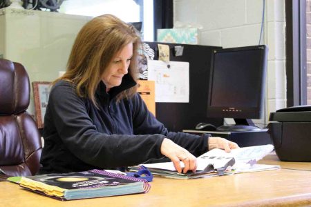 Teacher Beth Trimble sorts through papers Tuesday at Blennerhassett Middle School. Teachers are compiling learning packets which will be sent home later this week for all students to continue lessons while schools are closed due to coronavirus. (Photo by Michael Erb)