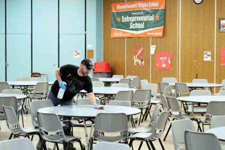 - Custodian Sean Stutler cleans tables Tuesday in the Blennerhassett Middle School cafeteria. Schools throughout the region and nation are shut down to help slow or prevent the spread of coronavirus. (Photo by Michael Erb)
